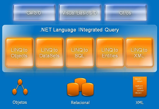 Esta imagen, describe mejor como trabaja LINQ, dentro de LINQ tenemos varias orientaciones, como es LINQ to Objects, LINQ to SQL, etc. Cada uno especifico para un origen de datos, como son Objetos, Relacionales y XML.